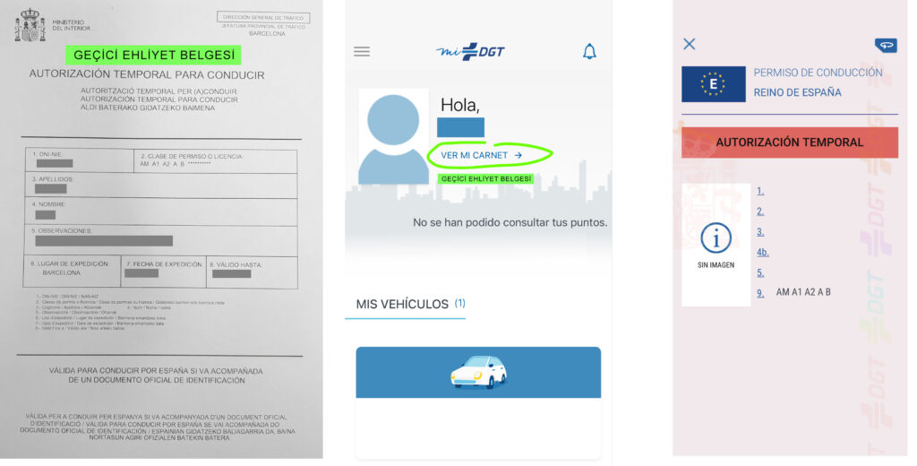 Geçici ehliyet olarak size bir kağıt veriyorlar. Bu kağıt ile İspanya içerisinde araba kullanabilirsiniz ama başka ülkelerde geçerli değil. Fiziki ehliyetin çıkmasını beklemeniz lazım. miDGT mobil uygulamasını da indirip geçici ehliyetinizi kullanabilirsiniz. Uygulamaya girince en başta isminizin hemen altındaki linke tıklayınca çıkıyor.