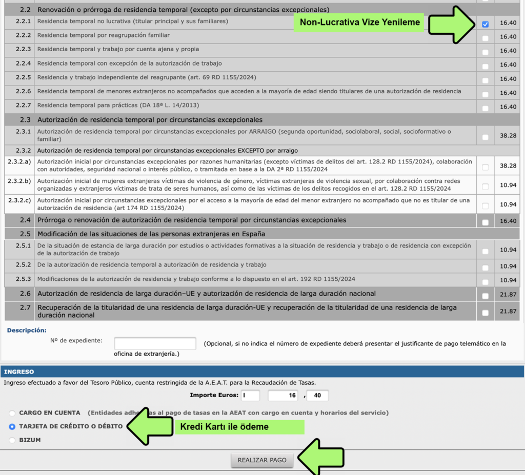 Şehir seçtikten sonra gelen sayfa aşağıdaki gibi görünecek. Bu sayfada başvuru yapacağınız vize türünü seçin. Örneğin 2.2.1 Non-Lucrativa Vize Yenileme, başvuru ücreti 16.40 Euro. Bu ücreti başvuru yapılacak her kişi için ayrı ayrı ödemek gerekiyor. Kredi Kartı ile ödeme yapmak için en alttaki TARJETA DE CRÉDITO O DÉBITO seçin ve REALIZAR PAGO butonu ile devam edin.