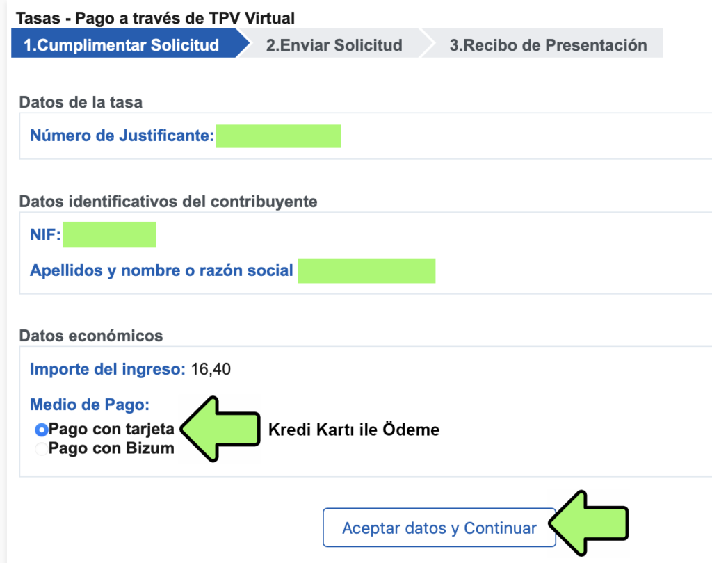 Açılan mesajları onaylayın ve sonraki sayfada online ödeme sayfasına gideceksiniz. Bu sayfa aşağıdaki gibi görünecek. Tarjeta (Kredi Kartı) ile ödeme seçip Continuar (Devam) butonu ile devam edin, kart bilgilerinizi girin ve ödemenizi tamamlayın. Ödemeyi tamamlayınca dekontu PDF olarak indirmeyi unutmayın.